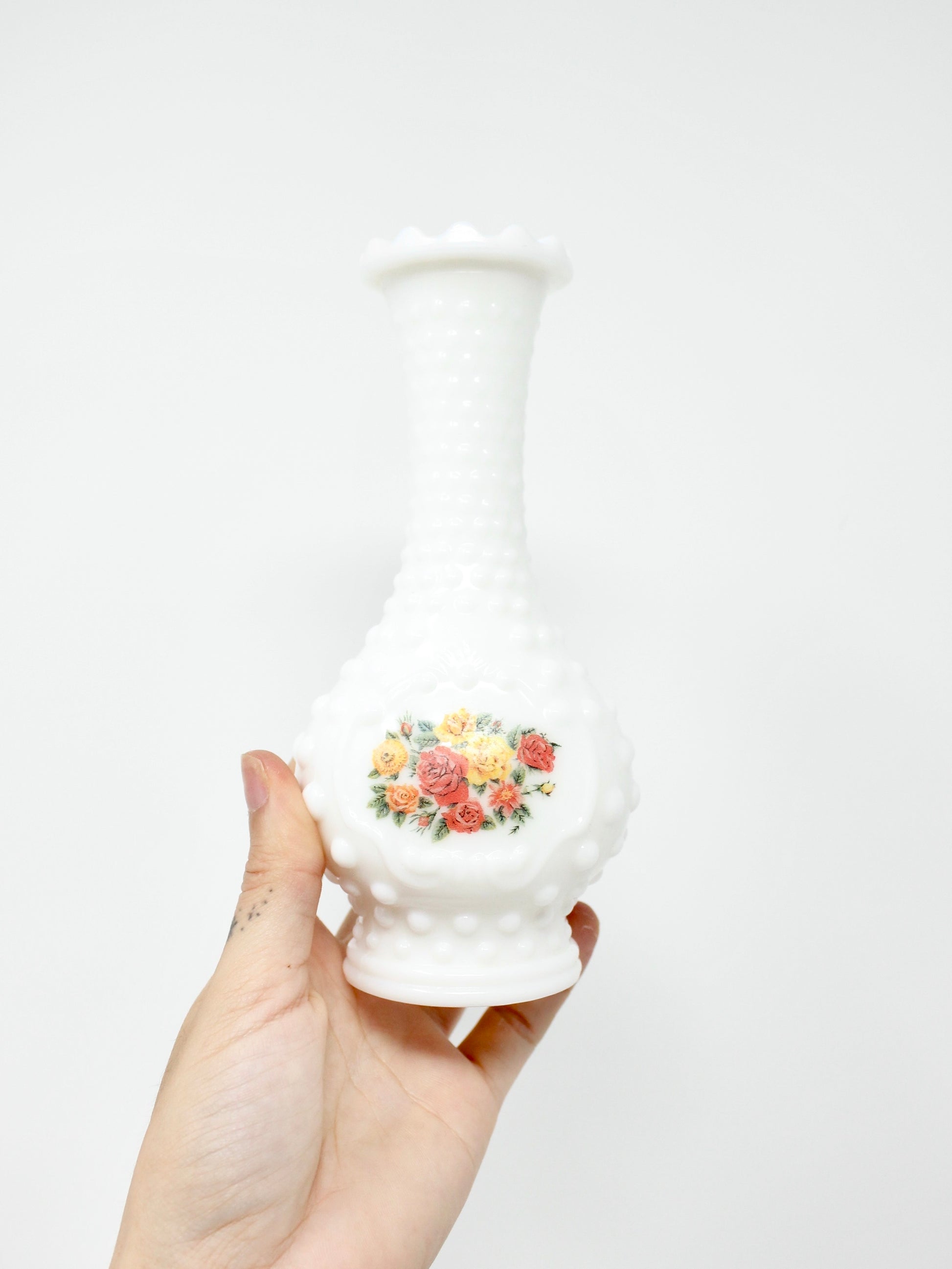 Vintage 70s Avon hobnail milk glass vase. Adorable raised dot pattern with a framed floral centerpiece design.