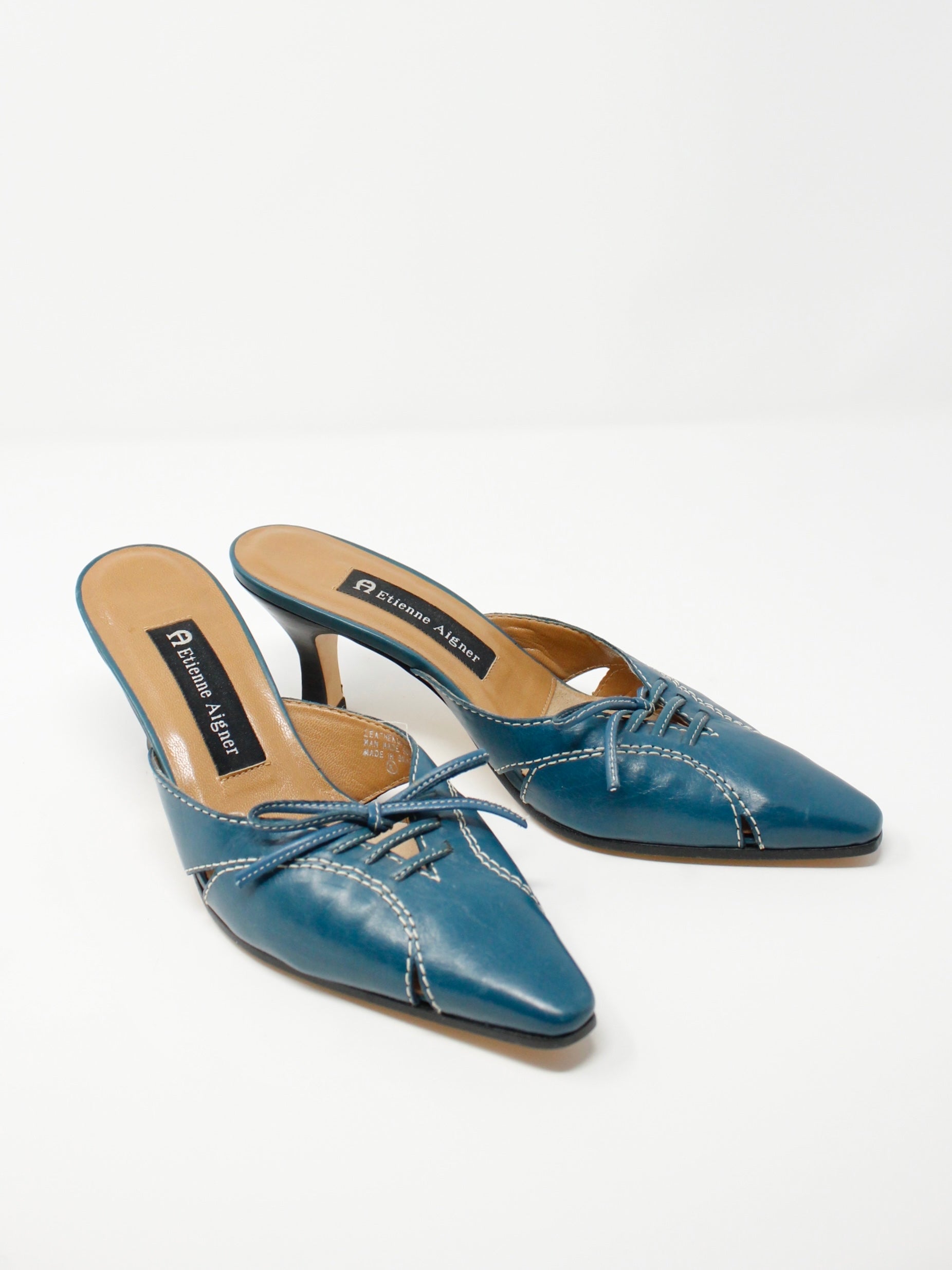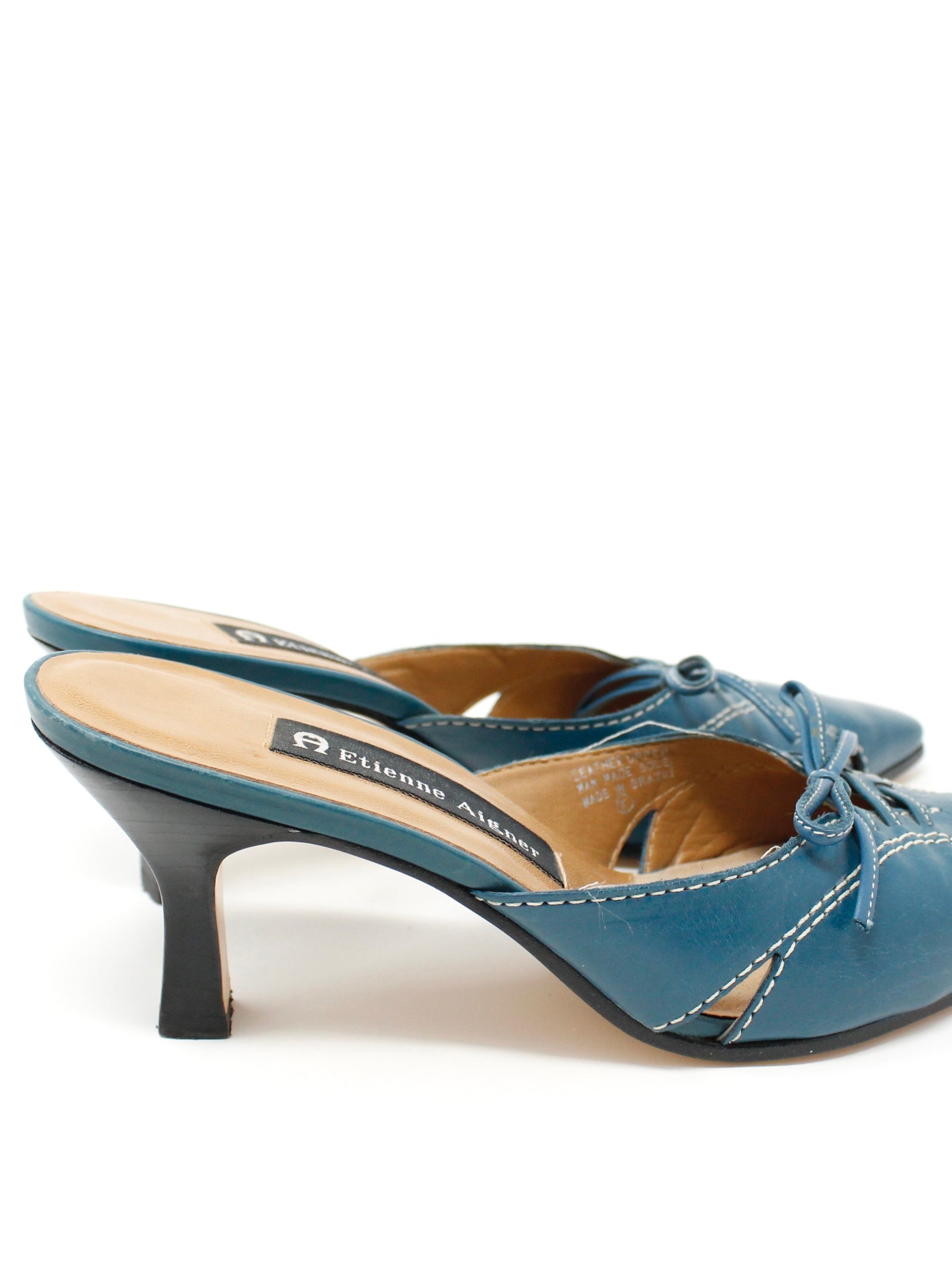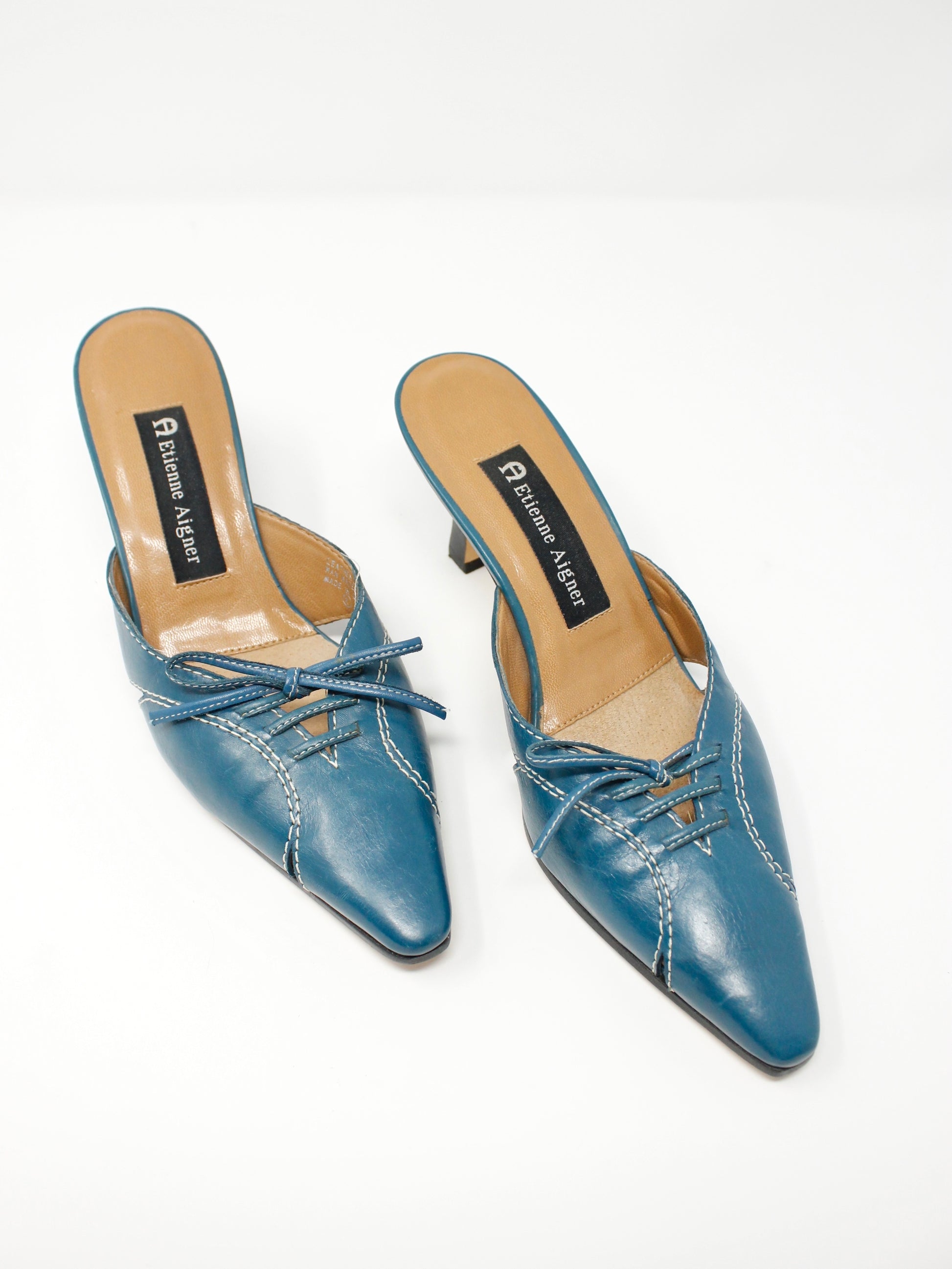 Y2K cerulean blue kitten mules with cutout + contrast stitch details and a lace-up bow on the toe. These are so classic and adorable! By Etienne Aigner. Leather Upper. Made in Brazil.