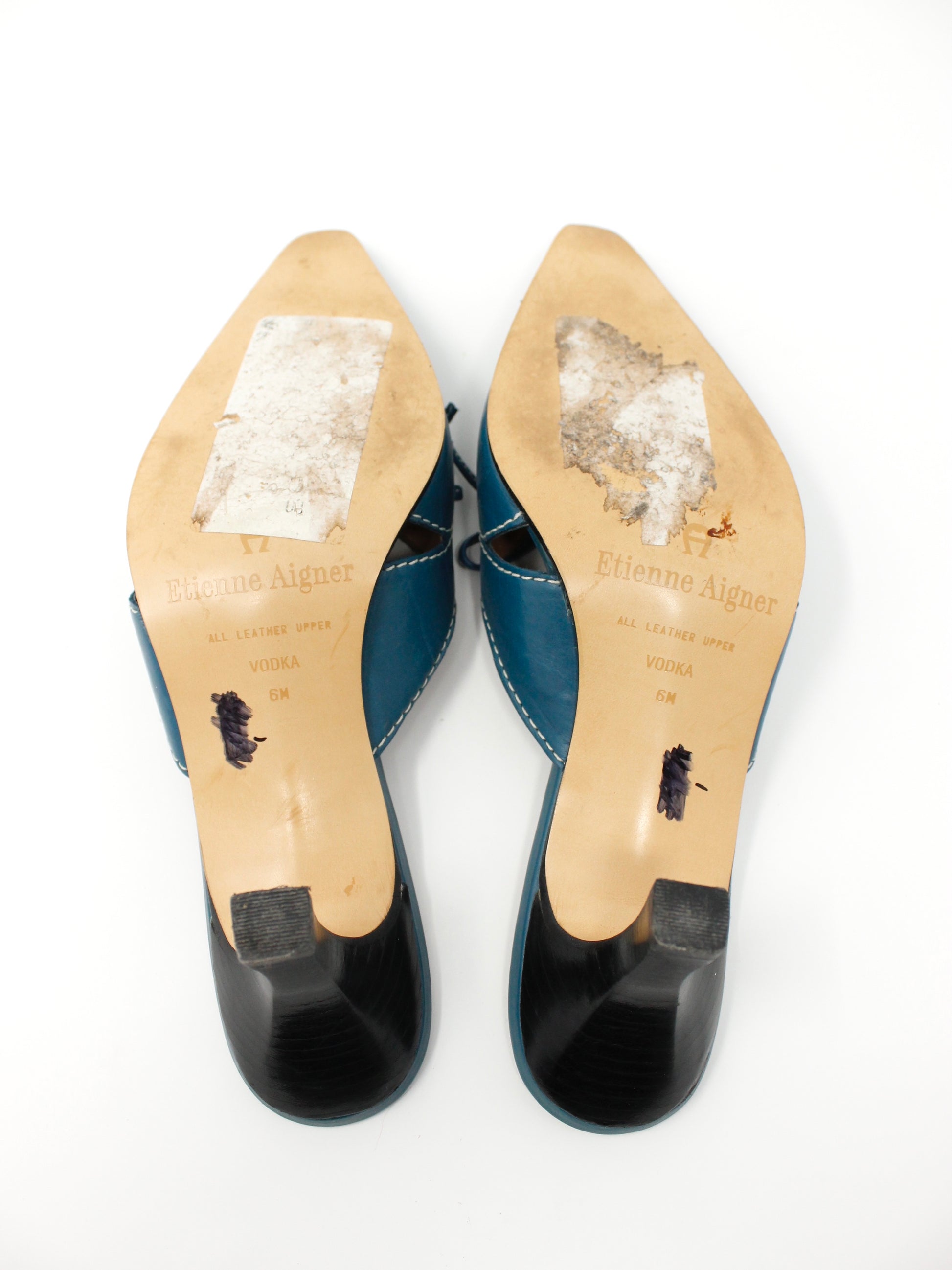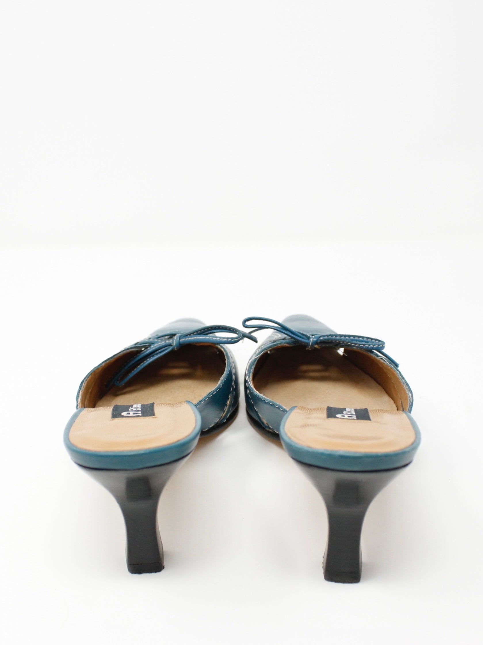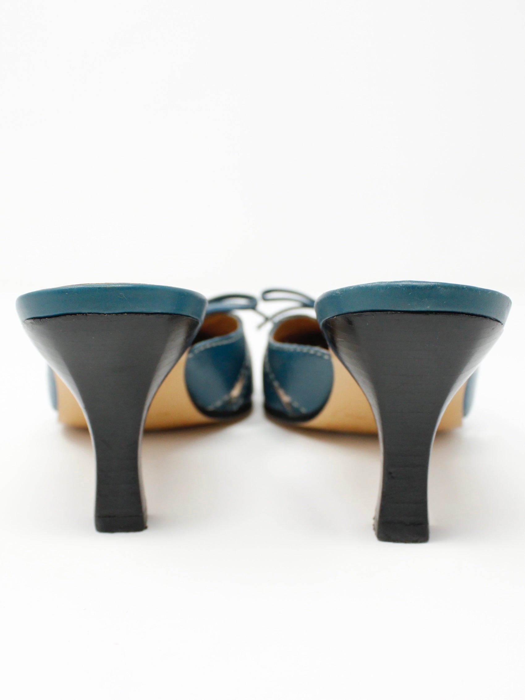 Y2K cerulean blue kitten mules with cutout + contrast stitch details and a lace-up bow on the toe. These are so classic and adorable! By Etienne Aigner. Leather Upper. Made in Brazil.