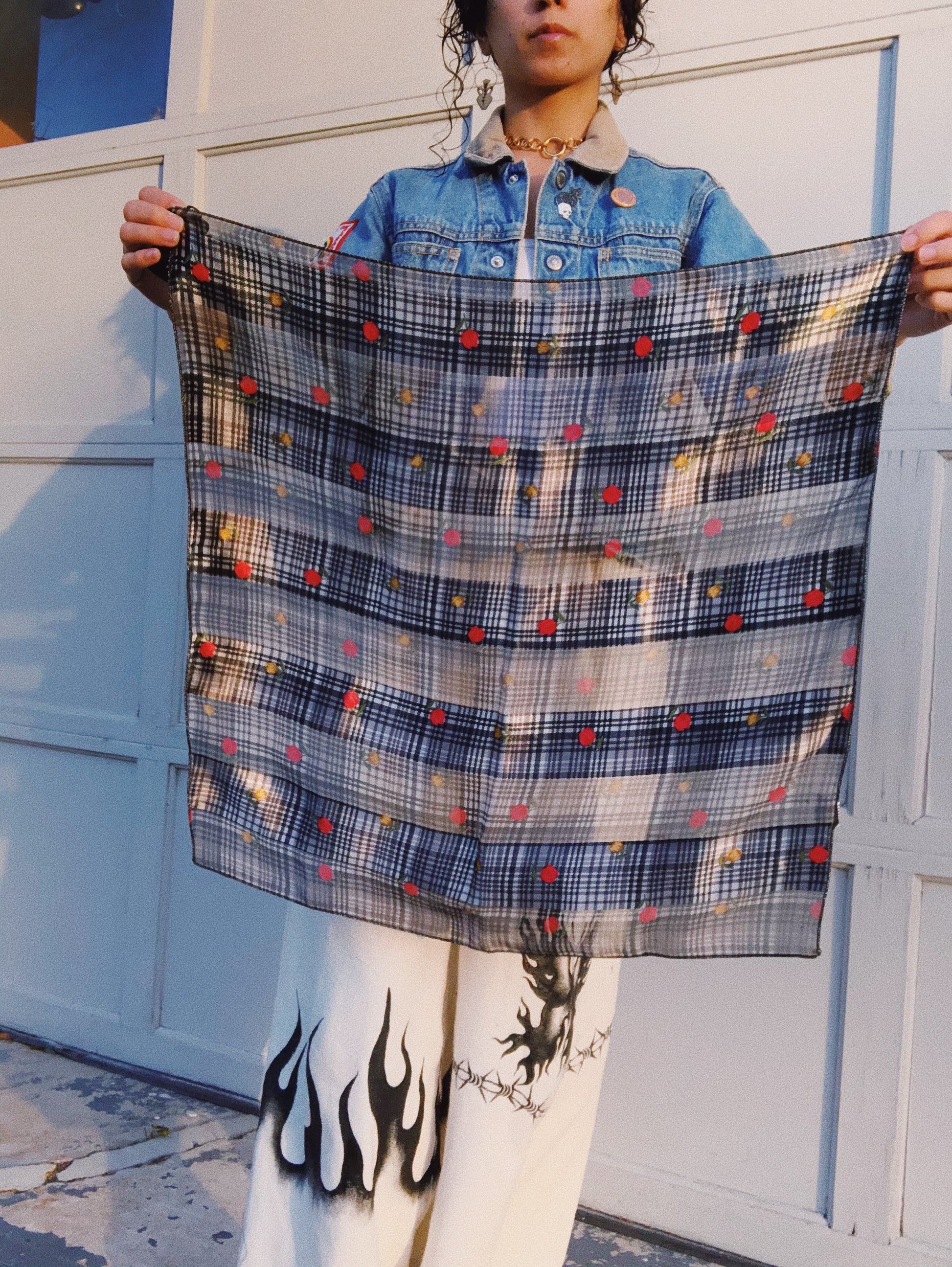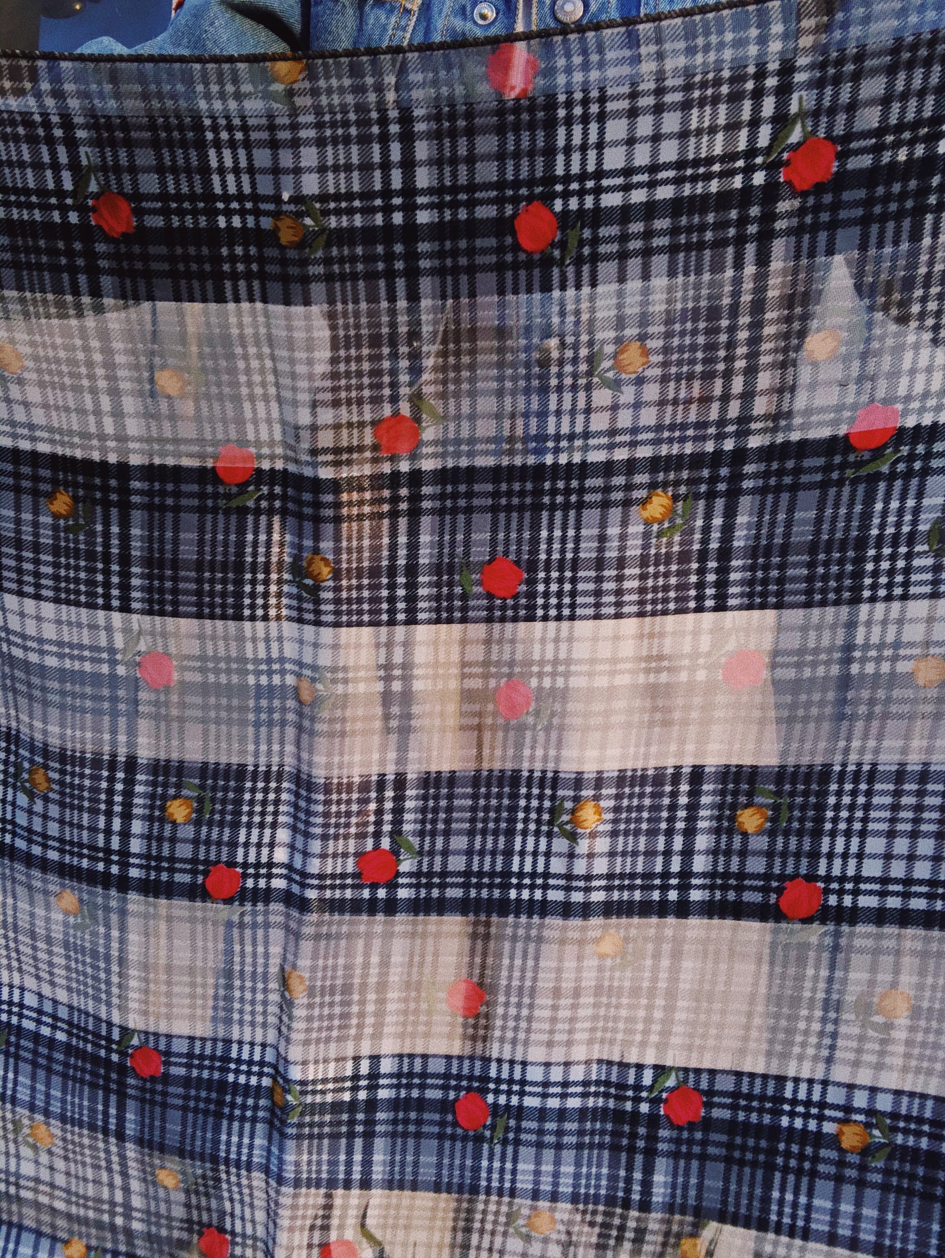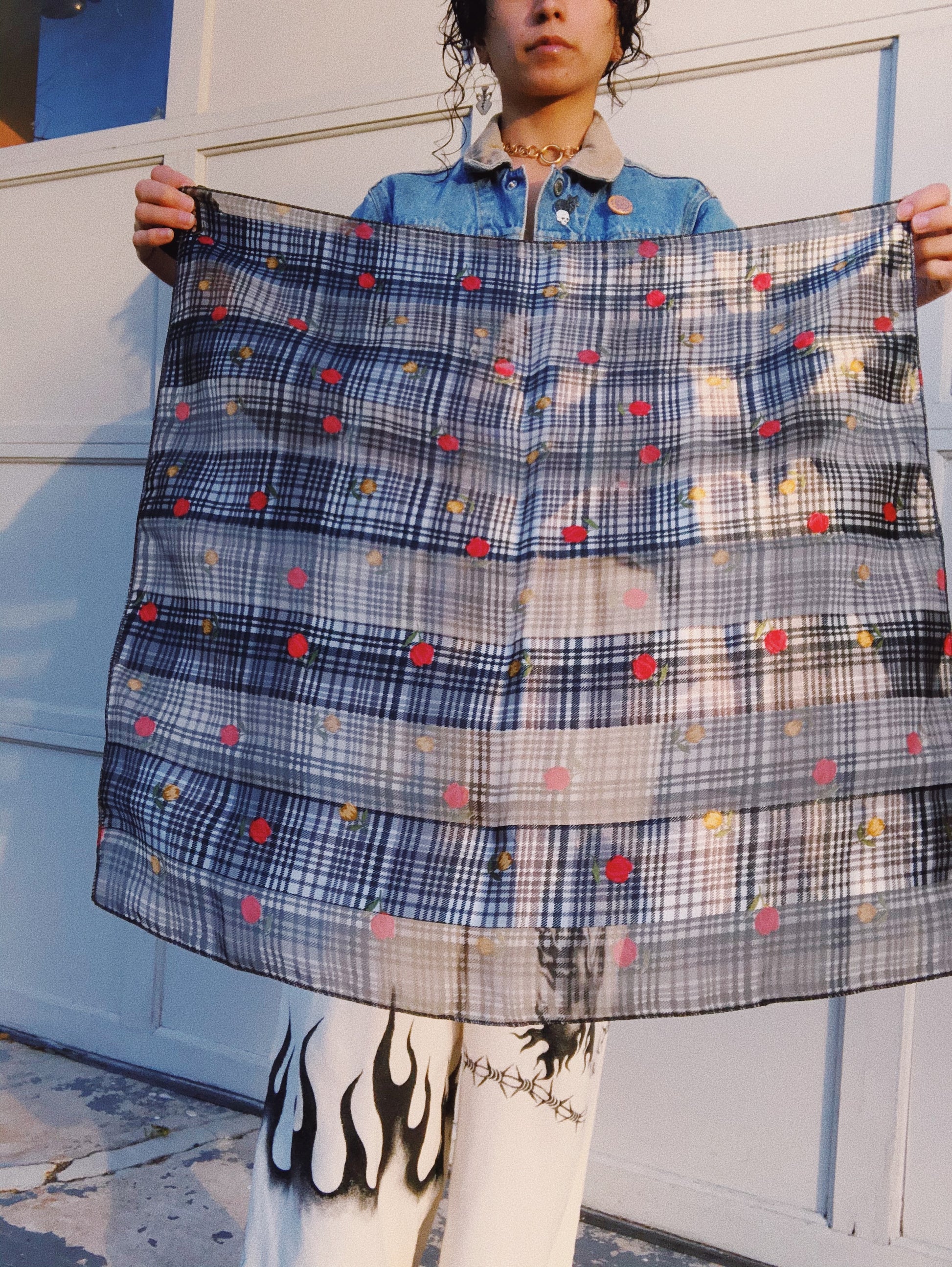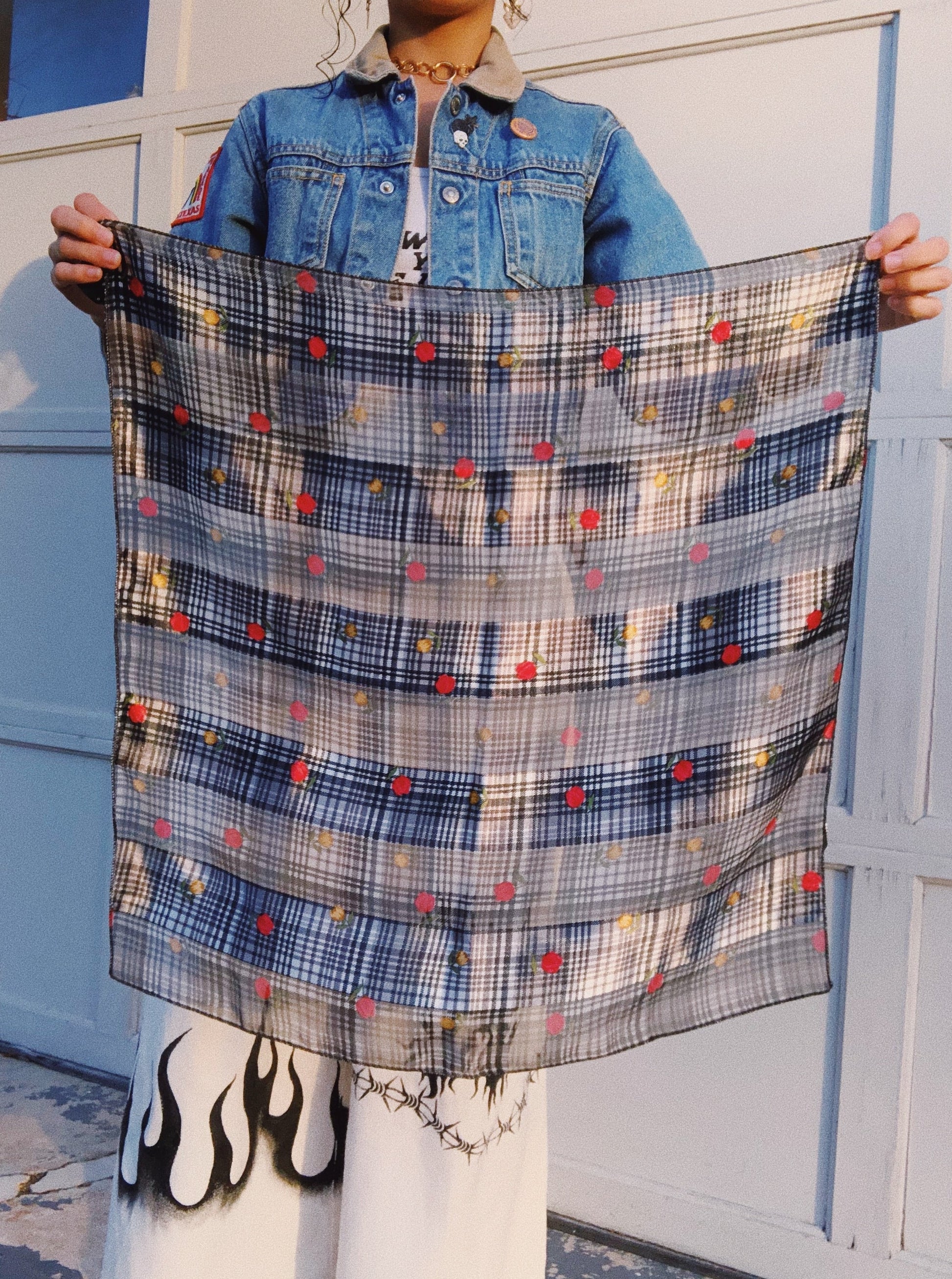 Vintage silvery-black plaid print scarf with red & yellow roses.