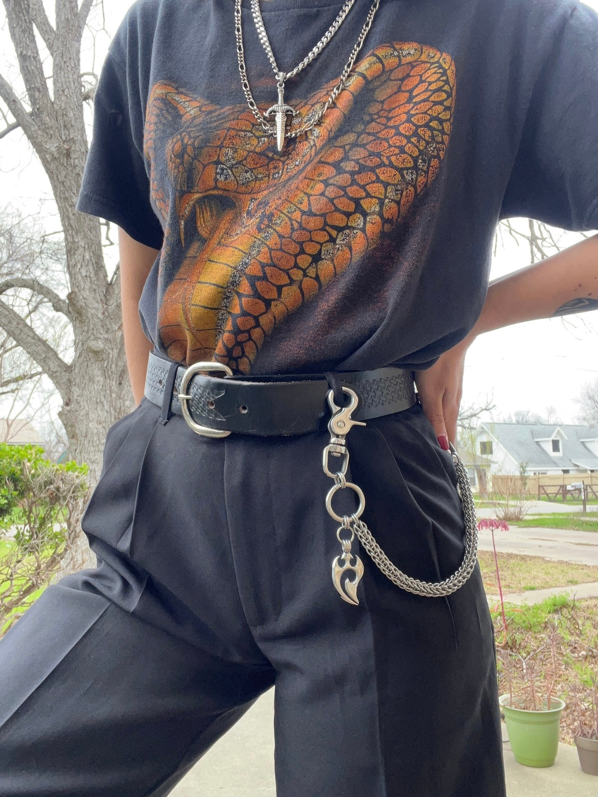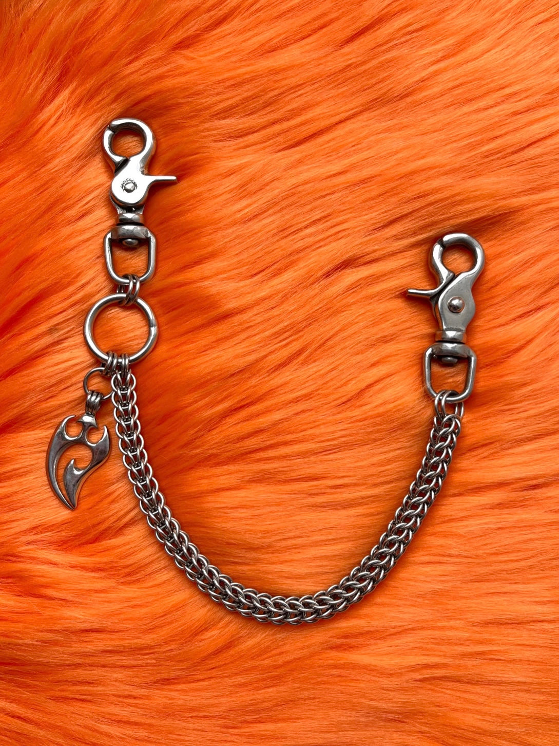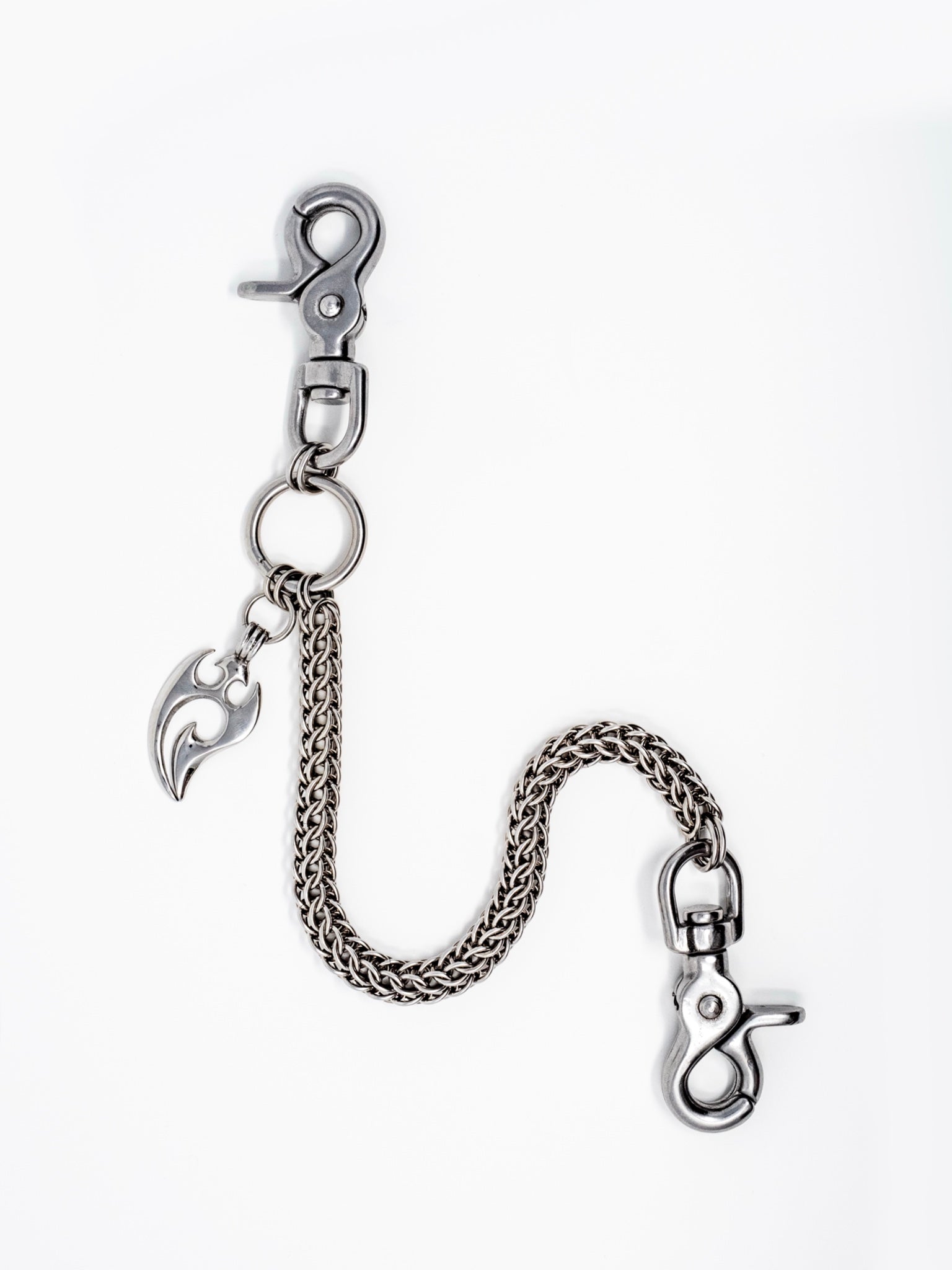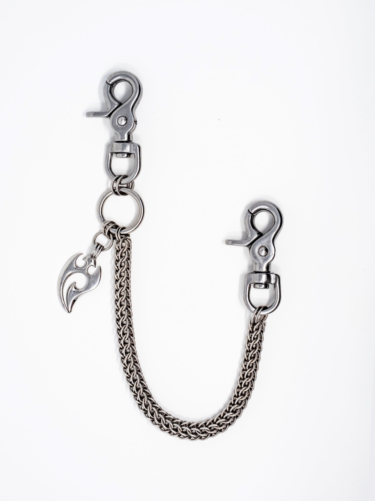 Toughen up your style with this simple and badass wallet chain! Features a 90s tribal inspired pendant, O-ring detail, and chunky scissor snaps that easily hook onto your belt loops