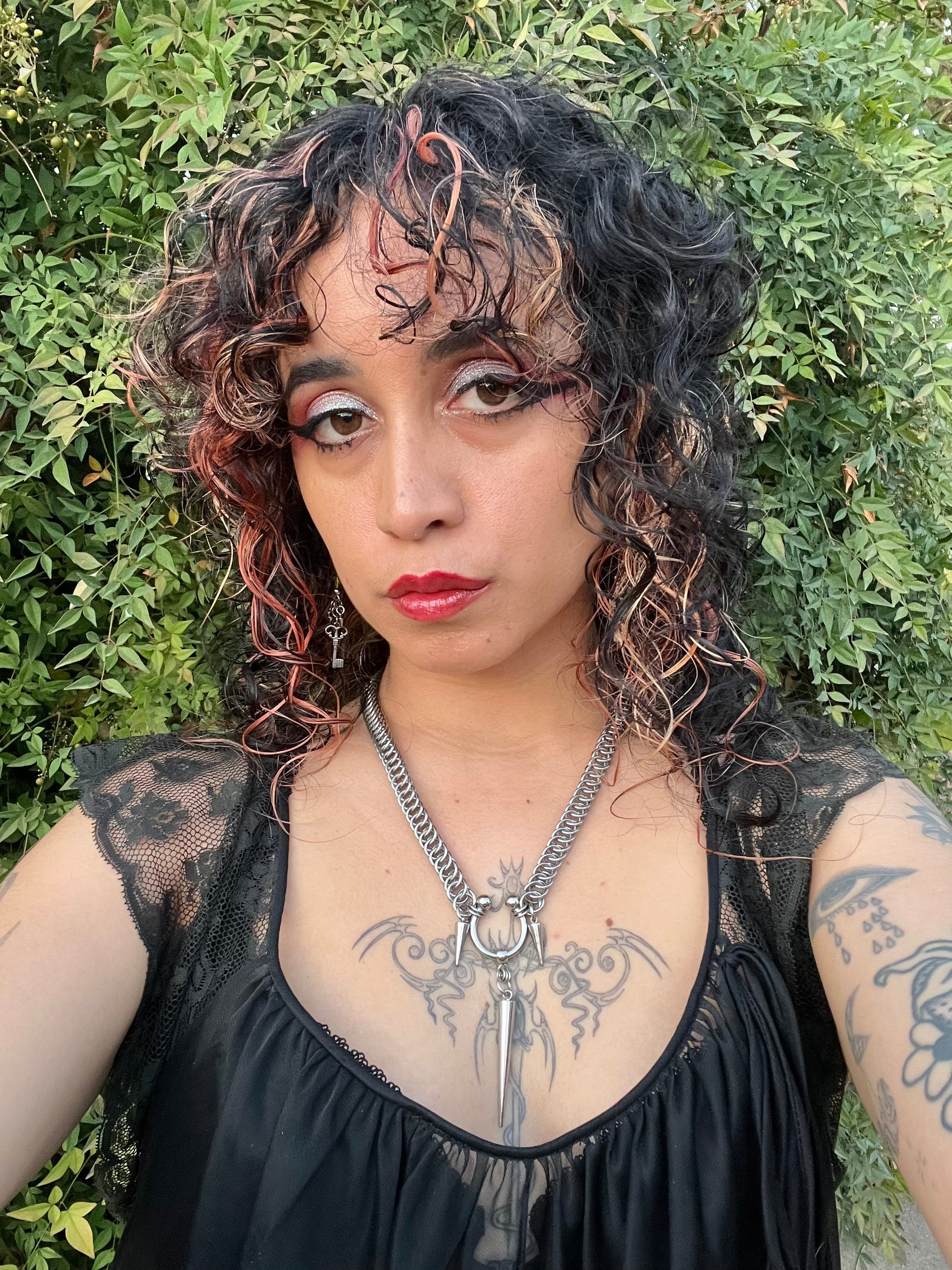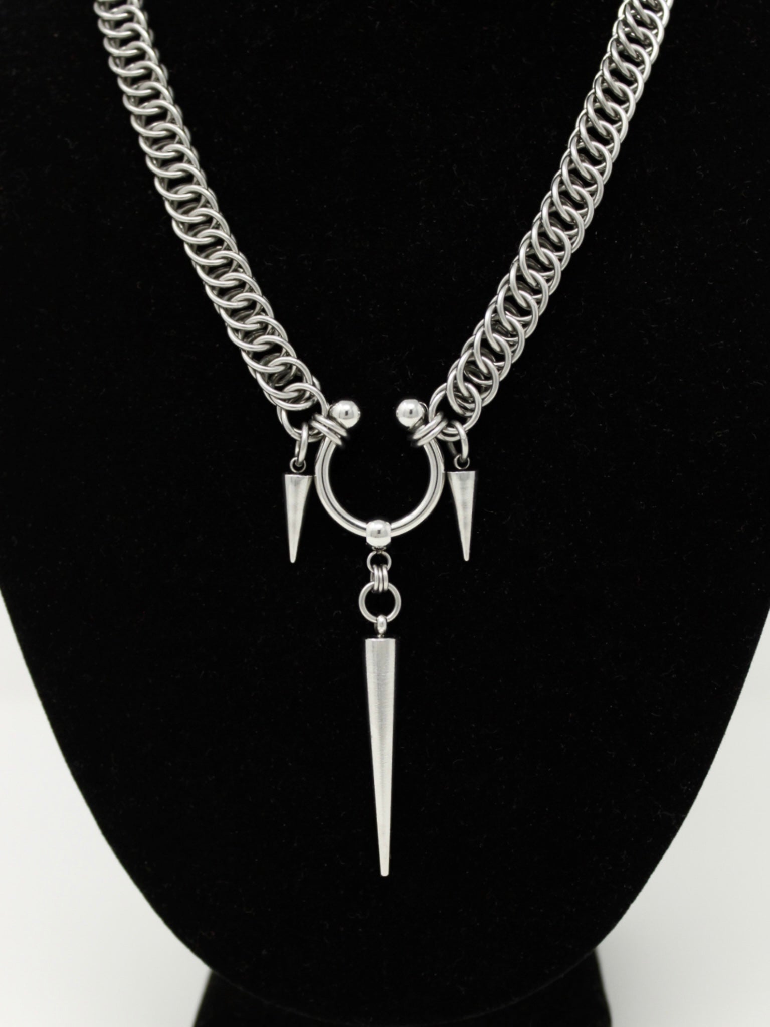 A trio of spikes pierce the threshold to the unknown. Centered on a chunky barbell and persian weave chain.