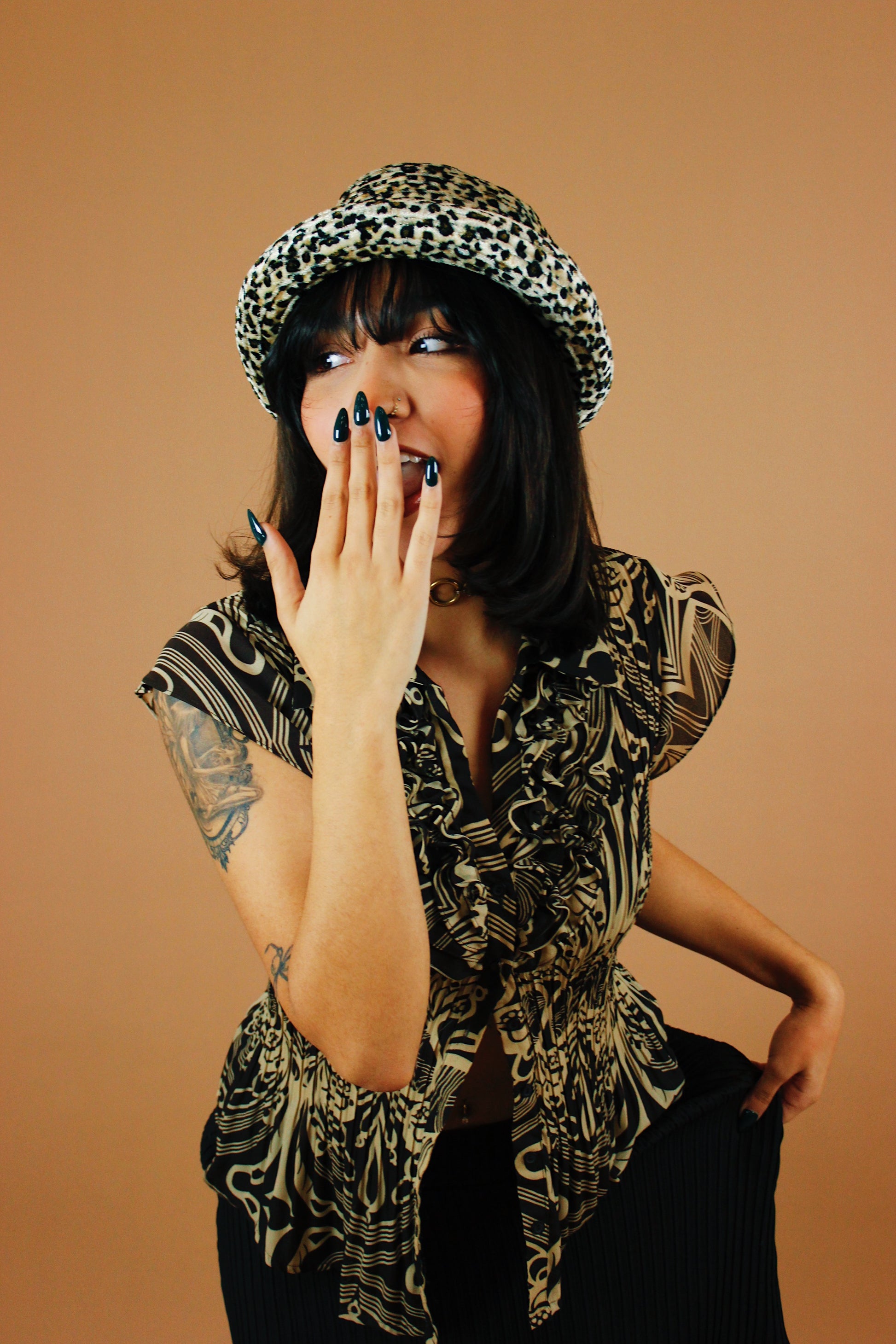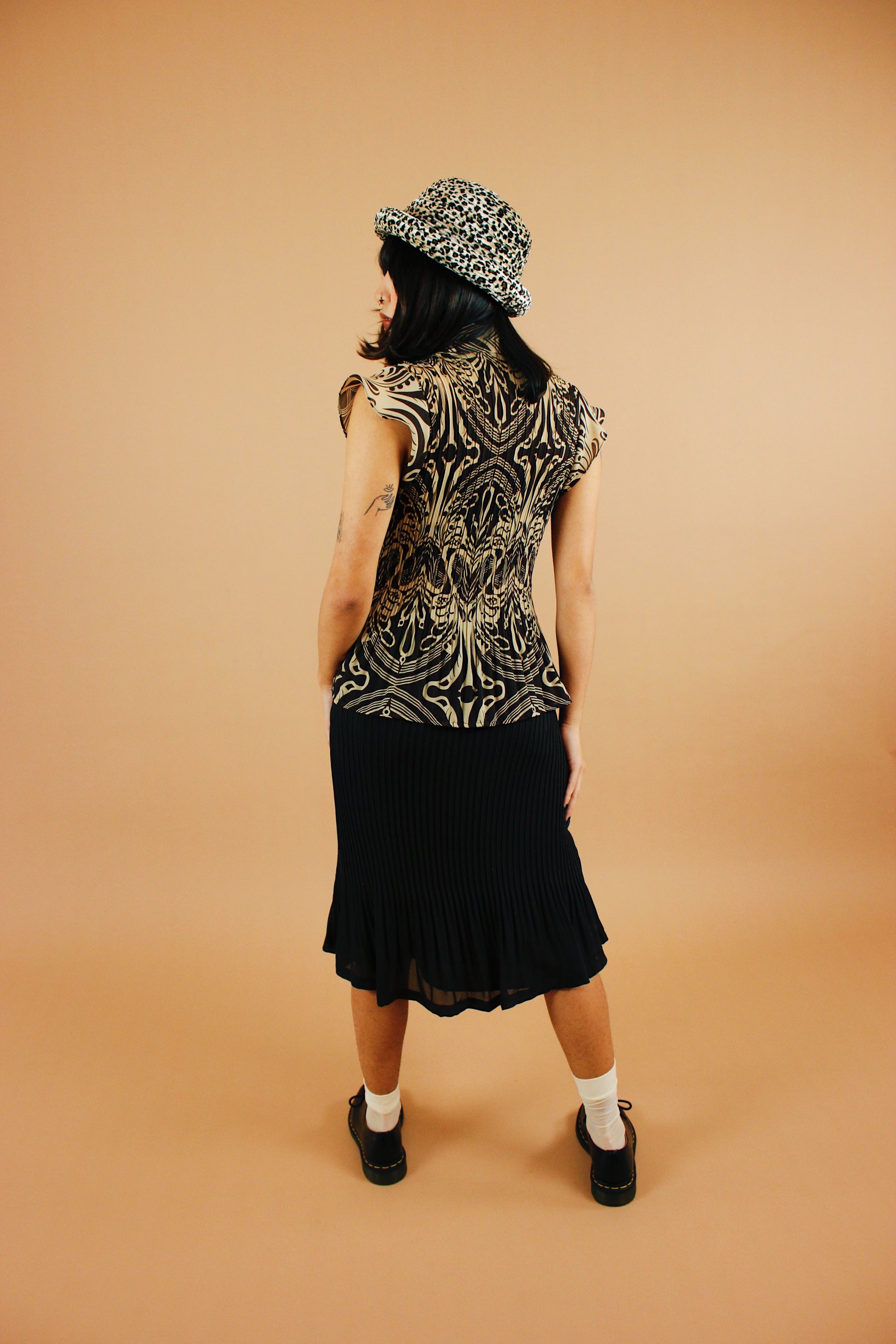 Y2K beige & chocolate brown trippy swirl print button up. Has accordian pleats, a ruffled neck, and cute fluttery cap sleeves. By Sunny Leigh. Tag size M, 100% Polyester. Best fits a S-M. Seen on Addy.